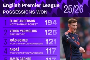 本賽季英超奪得球權(quán)次數(shù)排名: