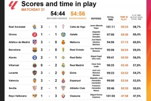 體育資訊1月27日訊 數(shù)據(jù)顯示,西甲第21輪沒有任何一場(chǎng)比賽的凈時(shí)間超過了60分鐘,平均凈時(shí)間為54分44秒。