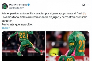 特爾施特根社媒曬出比賽照片,并寫道:“我在蒙蒂利維的首場(chǎng)比賽,感謝大家一直到最后的全力支持。”