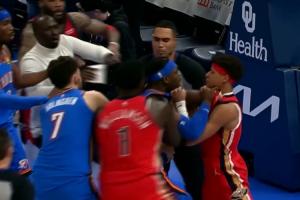 GIF-雷霆鵜鶘比賽都結束了 雙方爆發(fā)沖突 多特費爾斯互掐 費爾斯多次沖鋒被攔
