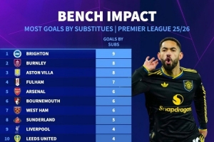 體育資訊1月28日訊 德國轉(zhuǎn)會市場統(tǒng)計(jì)了本賽季各隊(duì)替補(bǔ)球員在英超比賽中的進(jìn)球數(shù)量,并列出榜單,布萊頓9球居首,曼城、曼聯(lián)1球墊底,曼聯(lián)替補(bǔ)球員唯一的進(jìn)球就是庫尼亞對陣阿森納的制勝球。