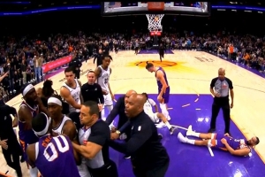 最終判罰:杰明、小波特、曼恩、奧尼爾、阿倫,這五人每人一個技犯!技犯是三比二,所以其中四個罰球抵消,太陽罰一球!罰完之后雙方再爭球。