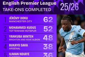 體育資訊1月28日訊 Squawka統(tǒng)計了本賽季球員在英超的成功過人次數(shù),并列出榜單,多庫62次成功過人居首。