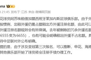 值得一提的是,由于涉及亞冠第三次報名,可以推斷,申花、海港、蓉城目前肯定已先于其他俱樂部開始了球員轉(zhuǎn)會注冊手續(xù)辦理工作。