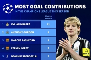 體育資訊1月29日訊 歐冠聯(lián)賽階段最后一輪比賽即將開賽,德國轉(zhuǎn)會市場盤點(diǎn)了參加歐冠球員參與進(jìn)球數(shù),姆巴佩11球居首,戈登、拉什福德8球位居次席。