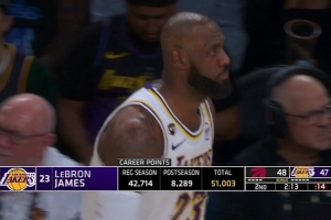 據(jù)統(tǒng)計,詹姆斯職業(yè)生涯總得分(常規(guī)賽+季后賽)突破51000分大關(guān),繼續(xù)創(chuàng)造歷史紀(jì)錄。