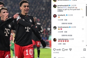 本場比賽穆西亞拉破門,賽后他也在個(gè)人社媒曬出本場照片,配文寫道:“回到歐冠取得很棒的勝利,很高興能夠收獲回歸以來的首粒進(jìn)球?!?/p>