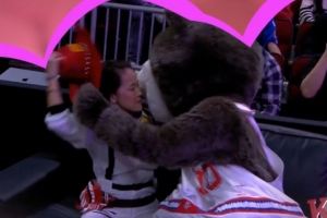 火箭主場(chǎng)迎戰(zhàn)馬刺,暫停是kiss cam環(huán)節(jié),鏡頭給到一位穿著馬刺球衣的球迷和他的女伴,隨后火箭吉祥物火箭熊叫來(lái)保安“逮捕”這位球迷,并和他的女伴熱吻。