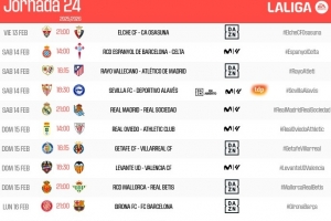 體育資訊1月29日訊 西甲官方公布了第24輪比賽的開球時(shí)間,2月15日4點(diǎn)皇馬vs皇家社會(huì),2月17日4點(diǎn)赫羅納vs巴薩。