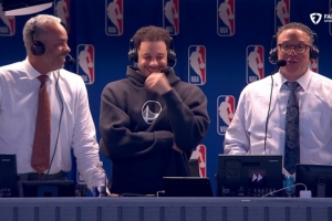 勇士主場(chǎng)迎戰(zhàn)黃蜂,比賽中勇士球員賽斯·庫(kù)里加入他的父親、黃蜂解說(shuō)員戴爾·庫(kù)里,一起解說(shuō)這場(chǎng)比賽,斯蒂芬·庫(kù)里則正在場(chǎng)上比賽。