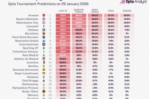 體育資訊1月30日訊 歐冠聯(lián)賽階段已經(jīng)結(jié)束了全部爭奪,除了已經(jīng)被淘汰的8支球隊(duì)外,OPTA對剩余球隊(duì)的奪冠概率進(jìn)行了預(yù)測,阿森納以29.8%居首,拜仁以14.9%位居次席。