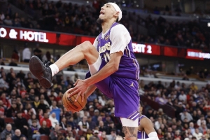 在此前湖人在客場(chǎng)以129-118擊敗公牛的比賽中,海斯曾上演搶斷反擊胯下暴扣的精彩戲碼。