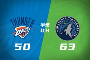 體育資訊1月30日訊 NBA常規(guī)賽,森林狼半場63-50領(lǐng)先雷霆。