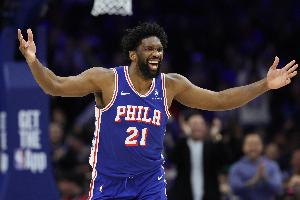 本賽季恩比德場均砍下25.7分7.4籃板3.9助攻,76人目前26勝21負(fù)排名東部第六。
