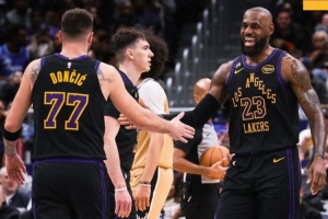 賽后湖人官方曬出贏球海報(bào),詹姆斯和東契奇登上封面,拉拉維亞也出鏡。