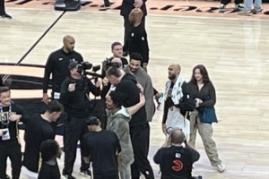 比賽結(jié)束后,綠軍冠軍成員、現(xiàn)老鷹中鋒波爾津吉斯(本場(chǎng)因傷沒有出戰(zhàn))擁抱了豪澤(本場(chǎng)命中10記三分),并與塔圖姆、懷特寒暄。