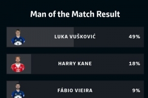 本場(chǎng)比賽漢堡球員武什科維奇打進(jìn)扳平進(jìn)球,賽后以49%的得票率當(dāng)選本場(chǎng)最佳球員,凱恩以18%排名次席。