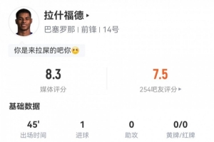 體育資訊2月1日訊 本輪西甲,巴薩3-1客勝埃爾切。此役拉什福德替補(bǔ)出場(chǎng)45分鐘,球員全場(chǎng)重點(diǎn)數(shù)據(jù)如下↓
