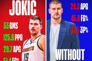 約基奇出場的33場比賽,掘金場均得分125.6分,29.7助,命中率51.4%,三分41%。
