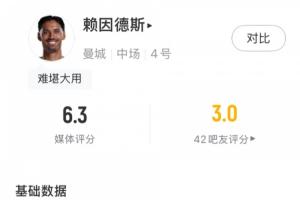 體育資訊02月02日訊 英超第24輪,熱刺主場(chǎng)2-2戰(zhàn)平曼城,本場(chǎng)比賽曼城中場(chǎng)賴因德斯替補(bǔ)出場(chǎng)20分鐘,發(fā)揮平平。