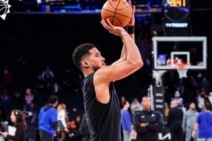 體育資訊1月18日訊 今天太陽(yáng)客場(chǎng)對(duì)陣尼克斯,布克也特地選擇了一雙和紐約有著關(guān)聯(lián)的一個(gè)配色。
