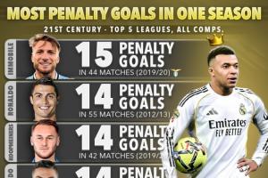 體育資訊02月03日訊 Score90統(tǒng)計(jì)了21世紀(jì)五大聯(lián)賽球員單賽季最多點(diǎn)球進(jìn)球榜,姆巴佩本賽季至今目前以12粒點(diǎn)球位居第七位。