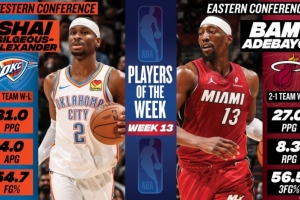 體育資訊1月20日訊 今日NBA官方宣布,雷霆球星亞歷山大和熱火球星阿德巴約分別被評為本賽季第13周西部和東部周最佳球員。