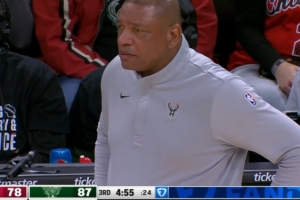 雄鹿上半場領(lǐng)先25分,但下半場被打出27-10,分差縮小至8分了,老里暫停但是沒啥效果。