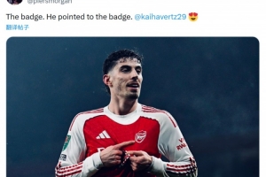 哈弗茨進球后手指隊徽慶祝,阿森納球迷摩根社媒曬出哈弗茨慶祝進球的照片,配文:“隊徽,他指著隊徽?!?/p>