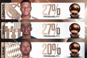 體育資訊02月04日訊 相關機構近期更新了2026年金球獎的獲獎概率預測,目前姆巴佩與亞馬爾并列領跑,兩人獲獎概率均為27%,凱恩和哈蘭德則緊隨其后。