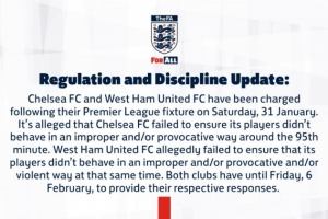 切爾西俱樂部未能確保其球員在第95分鐘左右不出現不當及/或挑釁性行為。而西漢姆聯俱樂部據稱也未能確保其球員在同一時間不出現不當、挑釁及/或暴力行為。兩家俱樂部須在2月6日周五之前分別作出回應。