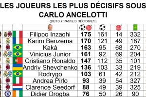 體育資訊02月05日訊 數(shù)據(jù)博主PopFoot盤(pán)點(diǎn)了安切洛蒂教練生涯中,他所執(zhí)教球員的直接參與進(jìn)球排行。其中,菲利普·因扎吉最多,本澤馬第2,卡卡第3,C羅第5。