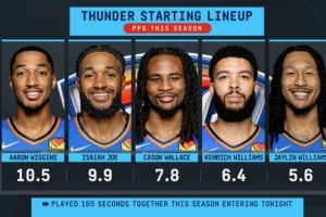本場比賽雷霆的首發(fā)是阿隆·維金斯、以賽亞·喬、卡森·華萊斯、肯里奇·威廉姆斯、杰林·威廉姆斯,其中僅有維金斯場均得分上雙,本賽季此前,這套首發(fā)僅合同打了105秒。