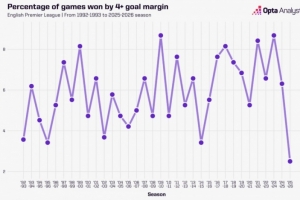 本賽季英超至今,只有2.5%的比賽以至少4個凈勝球的優(yōu)勢獲勝,這是該項(xiàng)賽事歷史上的最低比例。阿森納周六4-0大勝利茲聯(lián),這是本賽季第6場至少凈勝4球的情況,而在2023-24賽季,這樣的勝利出現(xiàn)了33次。
