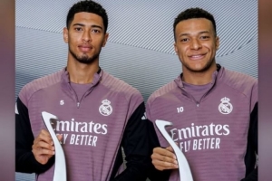 體育資訊2月5日訊 貝林厄姆今天更新Instagram,曬出自己與姆巴佩和FIFPRO最佳陣容獎杯的合影。
