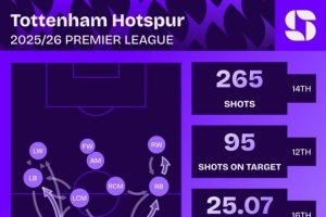 據(jù)Squawka統(tǒng)計,熱刺本賽季英超預(yù)期進球僅為25.07粒,但打進35球,超出預(yù)期進球9.93粒,熱刺是本賽季英超實際進球超出預(yù)期進球最多的球隊。