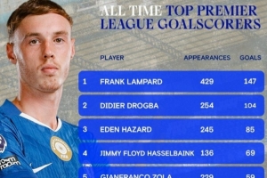 體育資訊2月7日訊 在本輪英超切爾西對(duì)陣?yán)顷?duì)的比賽中,帕爾默點(diǎn)射雙響,為球隊(duì)在英超打進(jìn)43球,超越特里升至隊(duì)史英超射手榜第8,以下為具體榜單: