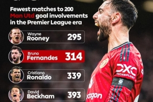 體育資訊2月8日訊 曼聯(lián)在本輪英超2-0擊敗熱刺,B費(fèi)取得進(jìn)球,也解鎖了為曼聯(lián)直接參與200球里程碑。數(shù)據(jù)統(tǒng)計顯示,他也是英超時代第二快達(dá)成此成就的曼聯(lián)球員。