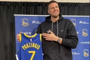 波爾津吉斯手持勇士7號(hào)球衣正式亮相。