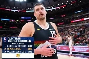 這是約基奇NBA生涯常規(guī)賽第182次三雙,超越“大O”奧斯卡·羅伯特森,獨(dú)占?xì)v史第二,榜首是威少(207次三雙)。