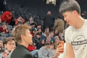 體育資訊2月8日訊 今日上午開拓者主場背靠背再戰(zhàn)灰熊,賽前演員任嘉倫來到場邊給楊瀚森加油,與其握手聊天。