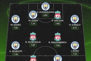 后衛(wèi):努內(nèi)斯(曼城)、格伊(曼城)、范戴克(利物浦)、奧賴?yán)牵?/p>