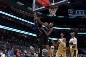在本場(chǎng)比賽中,阿德巴約在一次進(jìn)攻中直接隔著隊(duì)友韋爾完成了一次石破天驚的補(bǔ)扣。