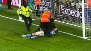 【哈寶:我不干凈了??】曼城打入第三球后,一名球迷沖進球場對躺在地上的哈蘭德又抱又親,隨后被保安人員拉離球場。這粒進球后來被判無效。