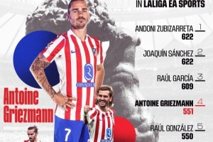 此役過(guò)后,格列茲曼已經(jīng)在西甲出戰(zhàn)551場(chǎng)比賽(204球97助),成為西甲歷史出場(chǎng)第四多的球員。