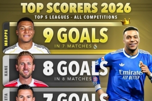 體育資訊2月10日訊 Score90統(tǒng)計(jì)了五大聯(lián)賽球員2026年各賽事的進(jìn)球數(shù)量,并列出2026年進(jìn)球榜,姆巴佩7場9球居首。