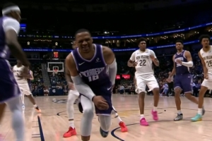 GIF-威少崴腳本來前場球,鵜鶘挑戰(zhàn)失敗補吹了瓊斯犯規(guī),威少獲得兩罰,全部命中繼續(xù)打