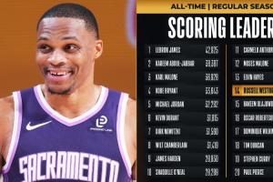 目前,國王球星威少已經(jīng)得到17分,NBA生涯常規(guī)賽總得分突破27000分大關(guān),成為歷史上第14位至少27000分的球員。