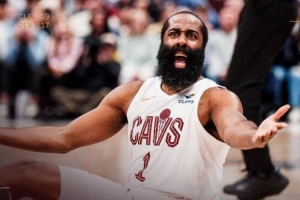 賽后,騎士官推發(fā)布贏球海報(bào),封面直接是哈登坐在地上對(duì)裁判攤手的瞬間。