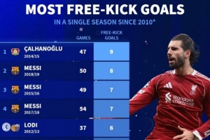 2010年后的五大聯(lián)賽球員單賽季各項賽事任意球進(jìn)球榜: